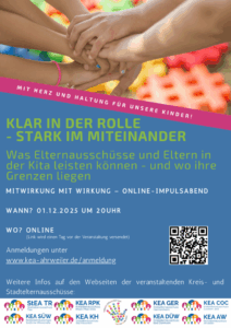 Online-Veranstaltung: Klar in der Rolle – stark im MiteinanderWas Eltern und Elternausschüsse in der Kita leisten können – und wo ihre Grenzen liegen Der Kreiselternausschuss Südliche Weinstraße (KEA SÜW) und acht weitere Kreis- und Stadtelternausschüsse aus Rheinland-Pfalz laden Sie herzlich zu einer Online-Veranstaltung ein. Unter dem Motto „Mit Herz und Haltung für unsere Kinder“ zeigen …